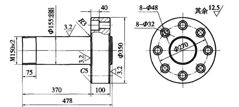銘澤機械廠家建議液壓機設備客戶在主缸活塞桿斷開處鑲一段桿接手(圖2),桿接手一端制成與活塞桿同直徑的圓盤,并制均布螺栓沉孔,以便用數(shù)個高強內(nèi)六角螺栓與主缸活塞桿連接,端部有承接的凸臺與活塞桿桿頭修理處相對應,另一端仍制成與斷掉的桿段相同的與滑塊孔配合軸段和緊固雙螺母螺紋段。