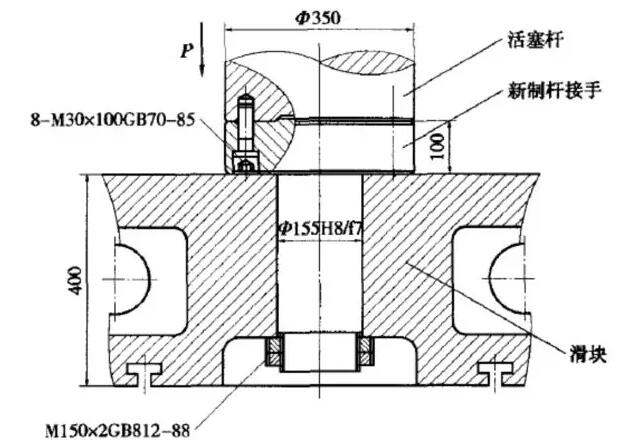 而其維修與修理過程詳細如下:拆除液壓機設備上的主缸活塞,將主缸活塞桿斷口處車平,并加工出與桿接手配合的止口,再加工均布的M30螺紋孔。按圖2制作桿接手。用M30高強內(nèi)六角螺栓將桿接手與活塞桿緊固在一體。將主缸和上橫梁垂直吊起,套入四個立柱之上,把上下立柱鎖緊螺母擰在立柱上,下鎖緊螺母應充分緊固,上鎖緊螺母則應稍留間隙備調(diào)整精度時用。充液桶安裝、加油,使主缸全行程動作數(shù)次,將油缸和管路內(nèi)空氣排除干凈。主缸活塞下行至與滑塊上平面相接觸后,用雙螺母固定(圖3)。滑塊與主缸活塞緊固聯(lián)結后,按規(guī)定精度調(diào)整,將立柱鎖緊螺母盡量緊固。進行負荷試車。在滑塊側(cè)面醒目位置上設警示標牌,標“不得超過最大偏心距使用,嚴禁超過滑塊的最大行程使用”。當修復后液壓機設備的開口高度由1200mm減小為1100mm,但仍可滿足工藝裝備要求。
