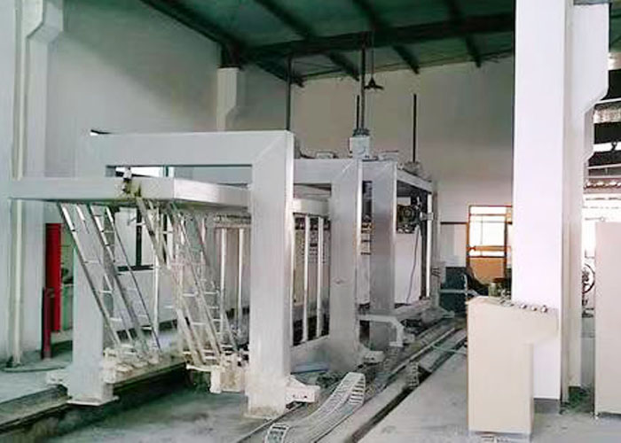 工作原理: 翻轉(zhuǎn)吊具把模具帶坯體一起空中翻轉(zhuǎn)90度置切割小車上,脫模把坯體連同側(cè)板留在切割小車上,切割小車由電機(jī)作動力行走,通過縱切裝置完成縱向切割、銑槽、水平切割;切割小車?yán)^續(xù)行走至橫切裝置中央位置停止后,橫切裝置啟動,橫切架自上而下垂直下切完成橫向切割;切割小車再行走至編組吊具處由編組吊具將坯體(連側(cè)板)吊至蒸養(yǎng)小車上,切割小車返回原始位置進(jìn)行下一個切割循環(huán)。 主要特點(diǎn): ⑴、 機(jī)型結(jié)構(gòu)精簡實(shí)用,便于安裝維修; ⑵、 坯體側(cè)立放置使坯體寬度為600mm,高度為1200mm,切割鋼絲短,不易拉斷,不易飄移,切割精度高; ⑶、 縱向切割裝置固定,切割小車行走完成縱向切割,切割時間短。橫切裝置采用鋼絲水平下切,縮短切割鋼絲長度,保證切割精度; ⑷、 坯體側(cè)立后可縱向切割時完成銑槽,不需另配槽口加工設(shè)備; ⑸、 本機(jī)型對坯體作六面切割,制品質(zhì)量不受模油及模具變形影響; ⑹、 本機(jī)型除生產(chǎn)砌塊外還可生產(chǎn)板材; ⑺、 機(jī)型切割過程(翻轉(zhuǎn)、縱切、橫切)分不同工位完成,各工位工作簡化,操作保養(yǎng)方便。